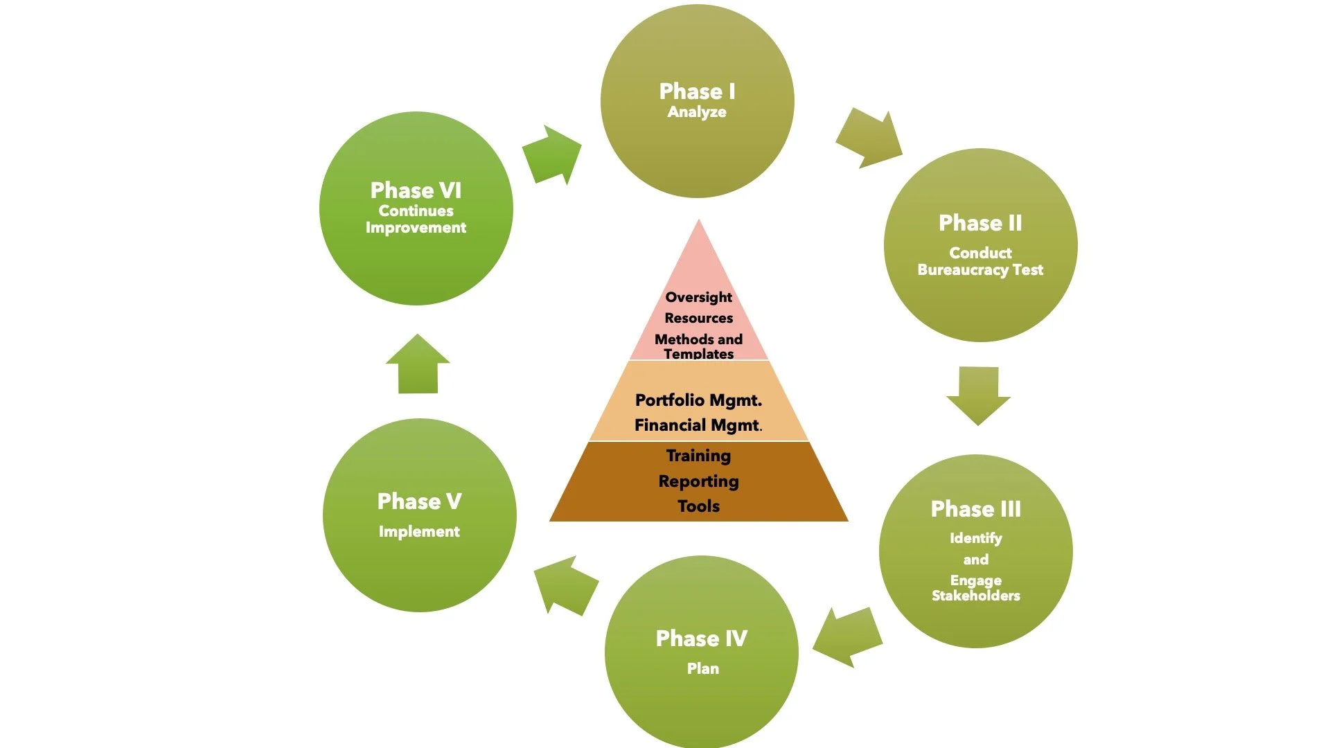 Potestas' PMO framework includes six necessary phases, starting with the analysis and ending with continuous improvements. The phases are shown as a loop since we recommend a continuous review of processes to assess the effectiveness of the program office. Understanding the key components of a PMO office is crucial to the success of the programs. The triangle shows the key components that have to be in place in a hierarchical manner.